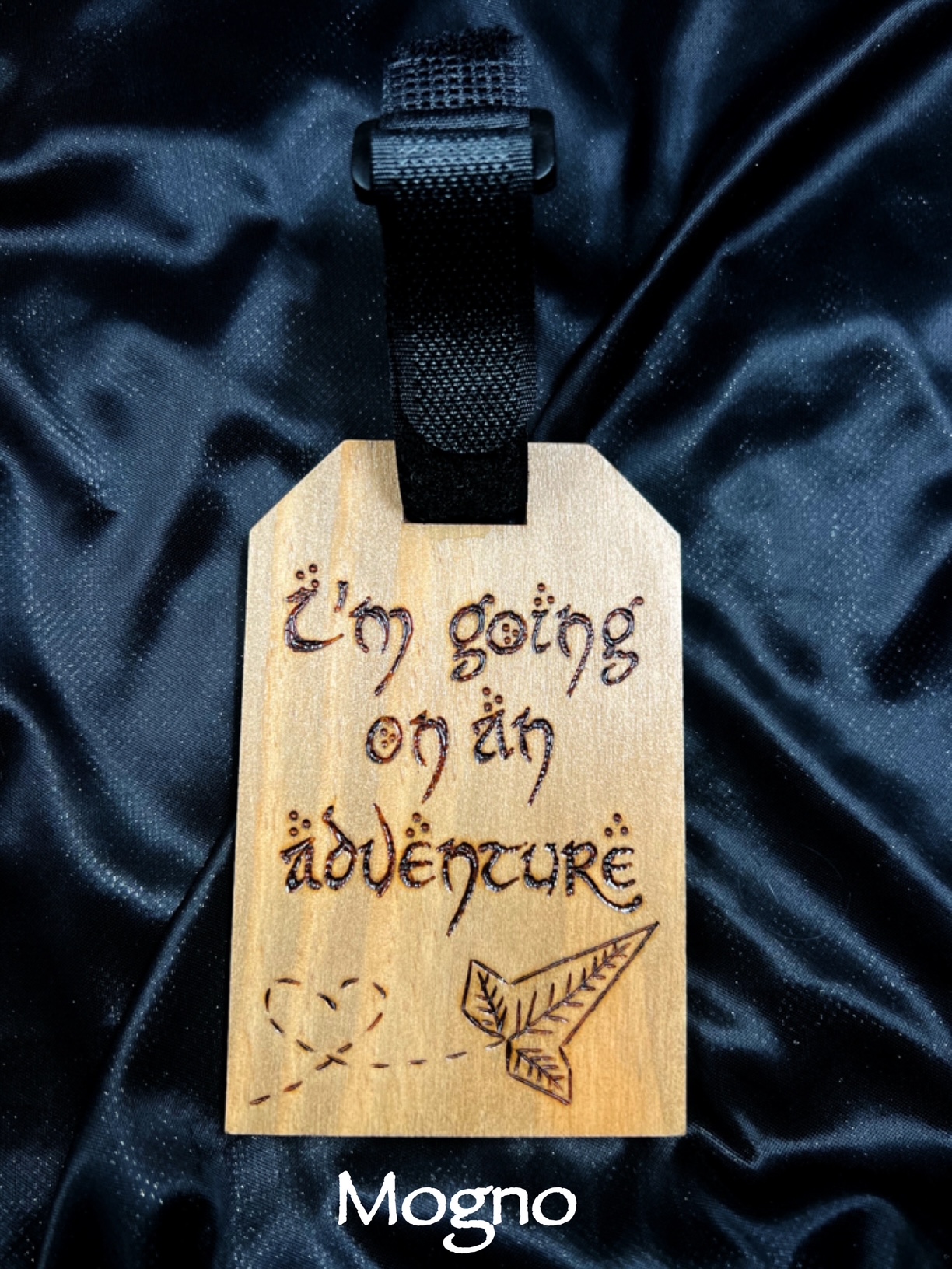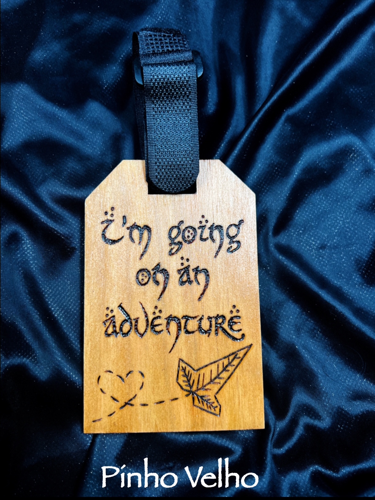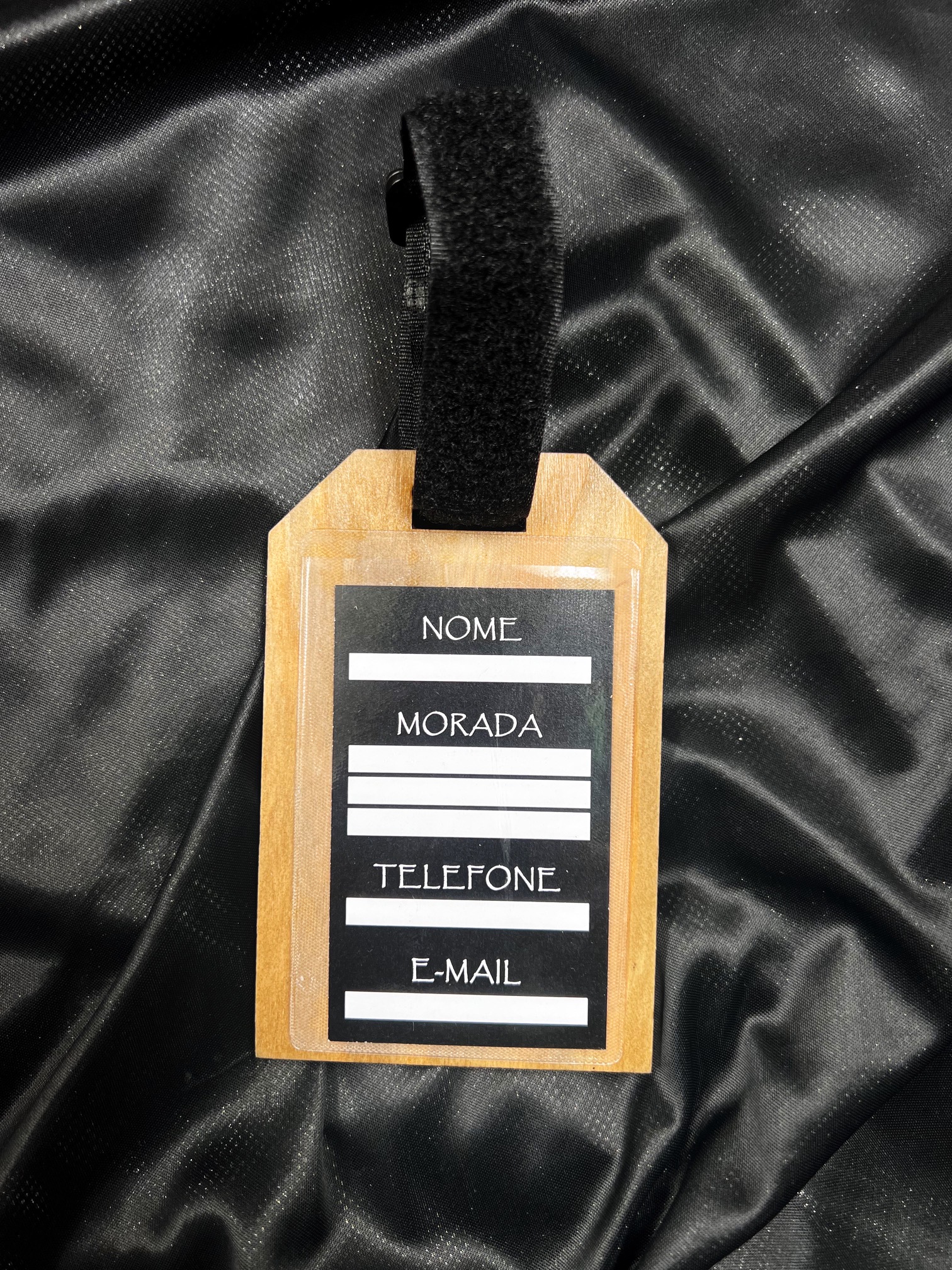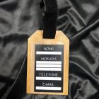 Etiqueta de bagagem feita em madeira de Pinho resistente.