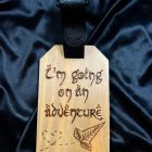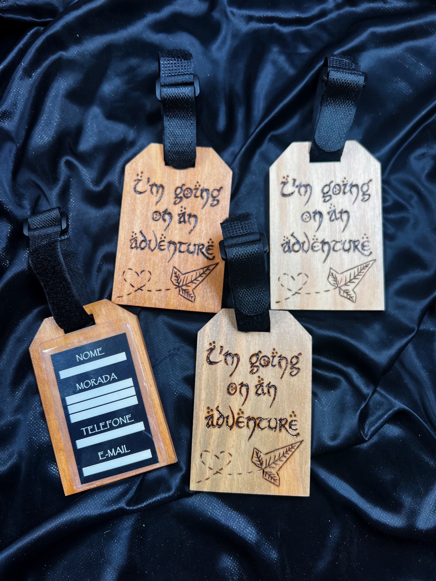 Pirogravura feita à mão, com envelope de plástico na parte posterior e cartão para colocar os dados pessoais.