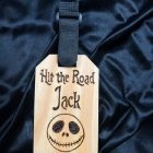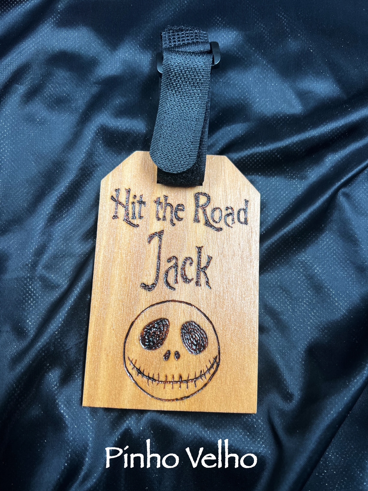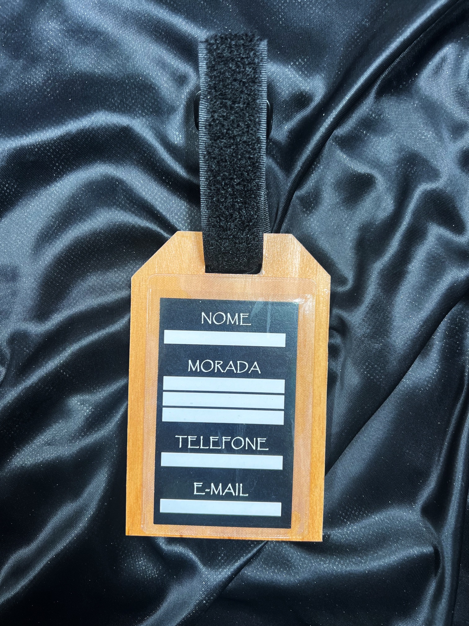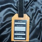 Etiqueta de bagagem feita em madeira de Pinho resistente.