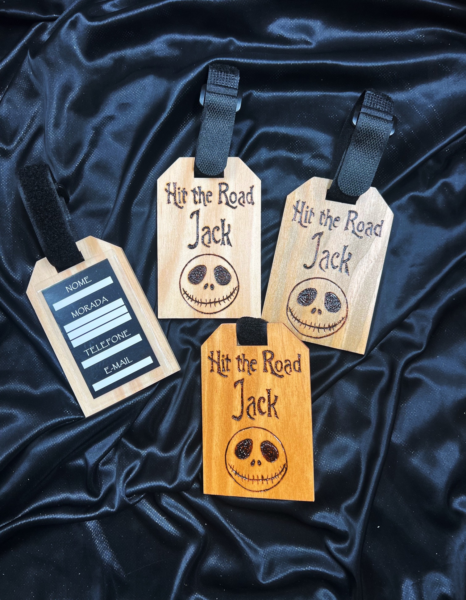 Pirogravura feita à mão, com envelope de plástico na parte posterior e cartão para colocar os dados pessoais.