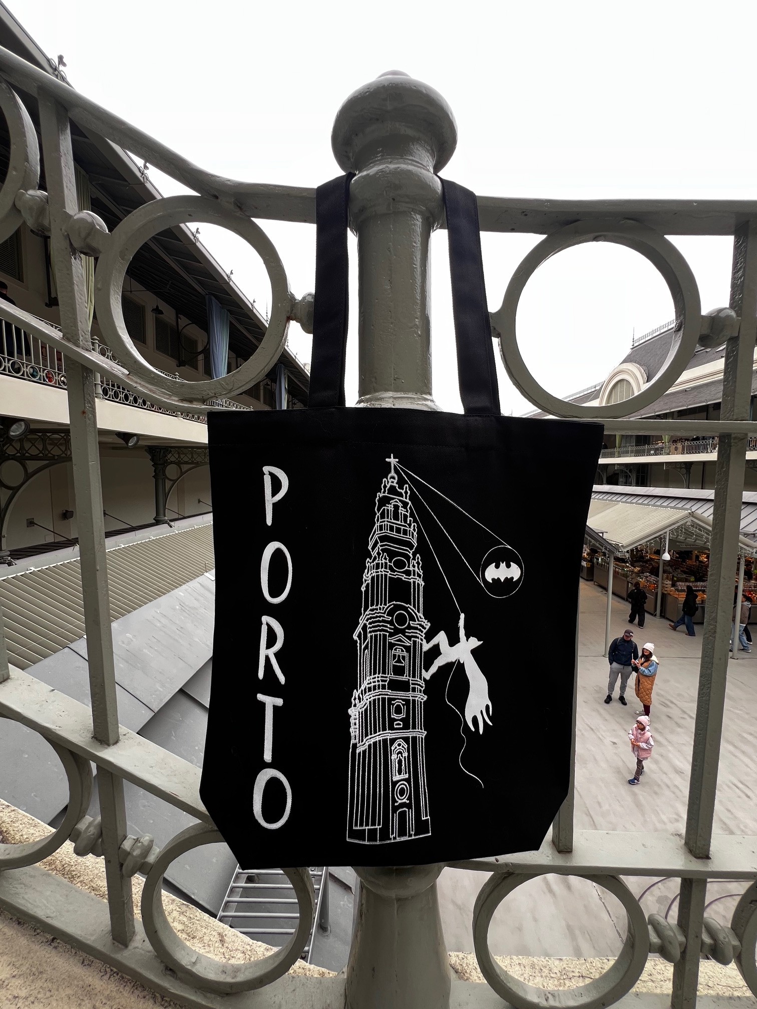 Saco feito à mão, 100% algodão de 260 g com serigrafia manual “Batman vs Torre dos Clérigos” .